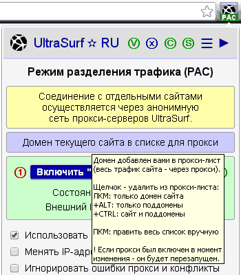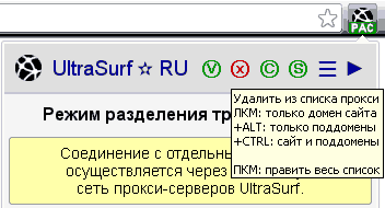 Функциональность этой процедуры не изменилась, но теперь вместо комбинации SHIFT + ЛКМ для добавления сайта и его поддоменов в список исключений для обхода прокси применяется комбинация CTRL + ЛКМ. Эта же комбинация применяется и при удалении сайта с его поддоменами, если они уже были ранее внесены в персональный список безусловного обхода прокси.